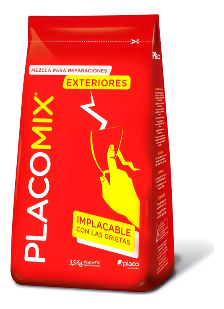 CARACTERISTICAS Placomix® EXTERIORES es una mezcla para reparaciones que sirve para arreglar grietas e imperfecciones en el exterior del hogar de la forma más fácil y rápida. No se contrae, dilata, resquebraja ni agrieta, manteniendo su estado original.