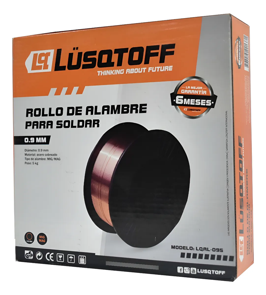 Alambre Mig Mig Soldar 0.9mm Rollo 5kg Lusqtoff Lqal-095 Es un alambre que ofrece excelente soldabilidad con una alta cantidad de elementos desoxidantes para soldaduras donde no pueden seguirse estrictas prácticas de limpieza. Este alambre es usado principalmente con gas CO2 y otras mezclas comerciales como el Atal. El alambre se recomienda para ser usado en aceros corrientes de baja aleación. Su contenido de silicio y manganeso le proporcionan propiedades desoxidantes, lo que asegura una 2 soldadura libre de porosidades sobre una amplia gama de trabajos. Aplicaciones típicas • Recipientes a presión • Soldadura de cañerías • Fabricación de carrocerías, muebles, extinguidores, etc. • Estructuras • Recuperación de ejes Esta soldadura ofrece un depósito prácticamente sin escoria reduciendo al mínimo las operaciones de lim - pieza